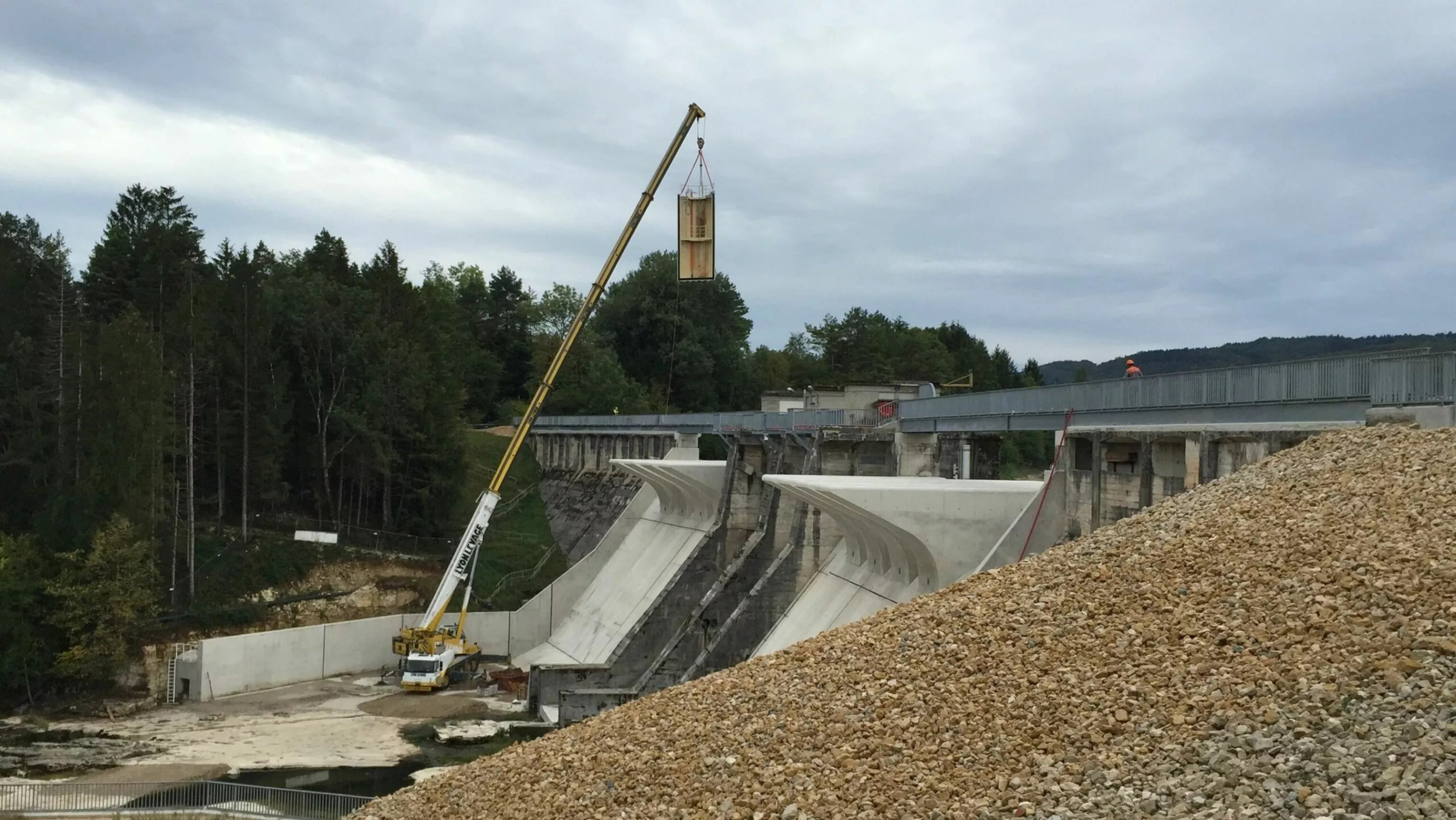 Dans ce cadre, EDF a engagé la construction d’un batardeau de chantier particulier (batardeau demi cylindrique : Hauteur 7,0m, Largeur 3,0 m, masse 8 tonnes), permettant, d’une part, la mise à sec partielle de la zone d’emprise de la nouvelle prise d’eau, et, d’autre part, de sécuriser le barrage notamment en cas de crue afin d’éviter la vidange du barrage par la nouvelle conduite en cours de construction.