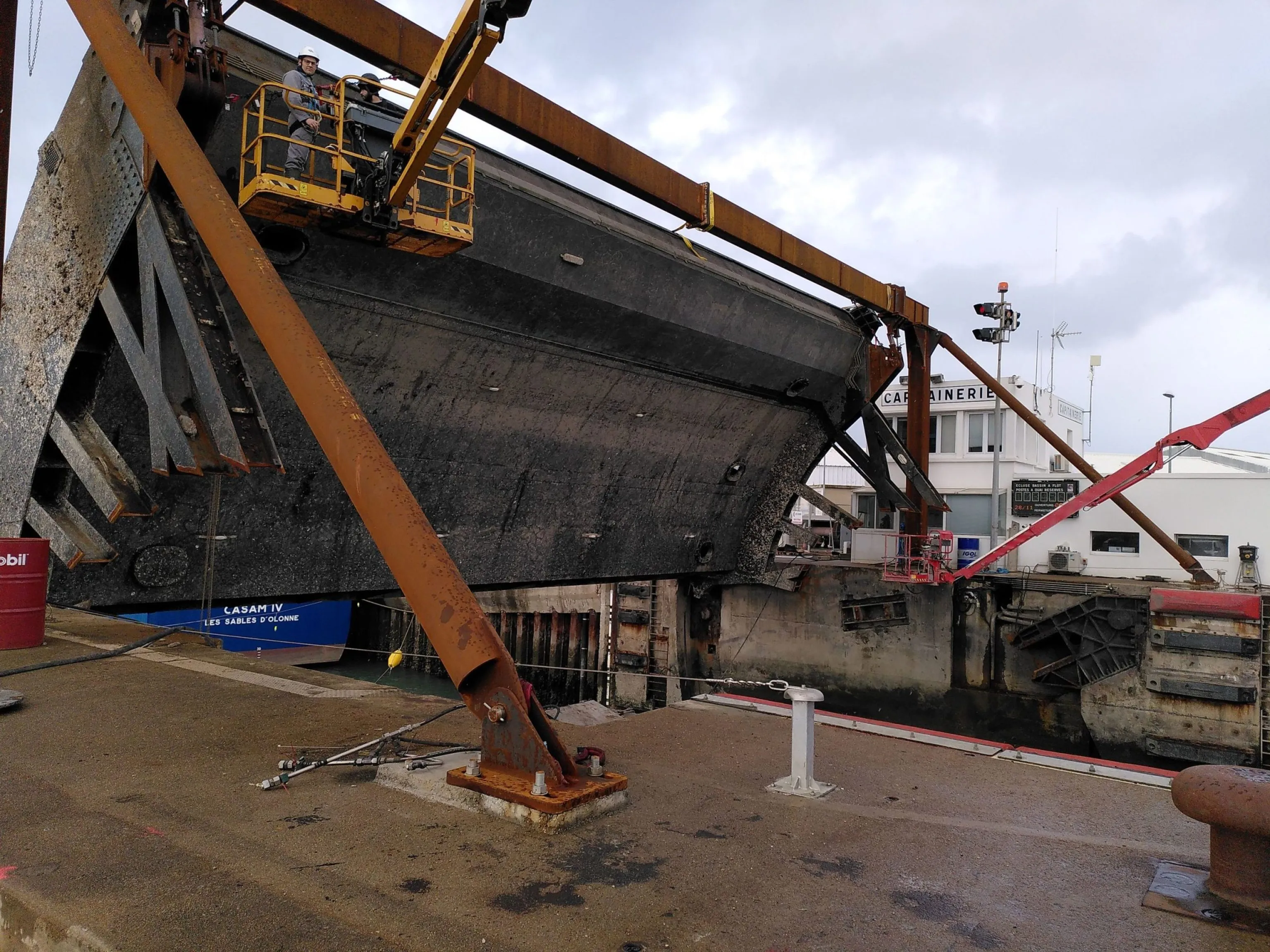 La porte a fait l’objet d’une première campagne de travaux de maintenance lourde en 2012 (carénage aussi suivi par ISM). En 2021, le système pneumatique de ballastage a été remplacé à neuf avec le contrôle commande. Est prévu en 2022 une nouvelle maintenance lourde sur la porte, car à 60 ans d’existence, des signes de fatigue préoccupants ont été observés (fissures au droit des paliers d’articulation, bruits dans les articulations).