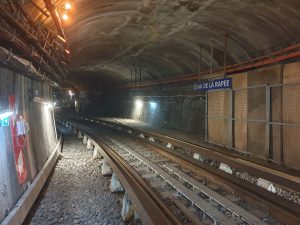 Le raccord entre les lignes 1 et 5 du métro parisien prend la forme d’un tunnel localisé sous le boulevard Diderot et à proximité immédiate de la Seine, Quai de la rappée